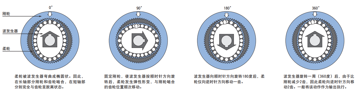 柔轮的外径略小于刚轮的内径,通常柔轮比刚轮少2个齿。波发生器的椭圆型形状决定了柔轮和刚轮的齿接触点分布在介于椭圆中心的两个对立面。波发生器转动的过程中,柔轮和刚轮齿接触部分开始啮合。波发生器每正时针旋转180°,柔轮就相当于刚轮逆时针旋转1个齿数差。在180°对称的两处,全部齿数的30%以上同时啮合,这也造就了其高转矩传送。