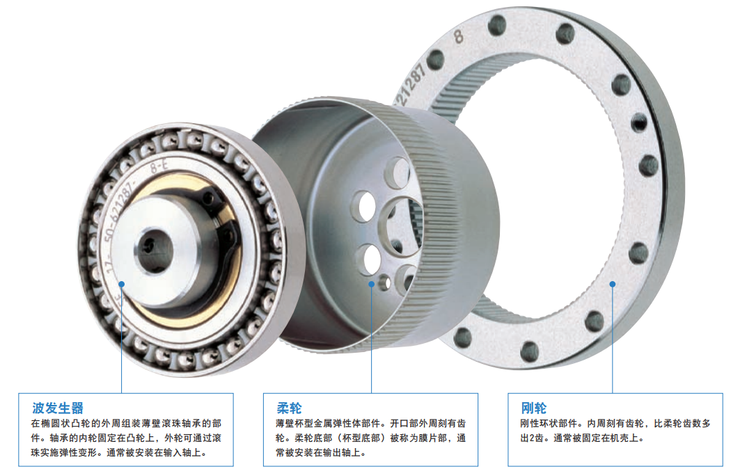 谐波减速机由“柔轮、波发生器、刚轮、轴承”这四个基本部件构成。
